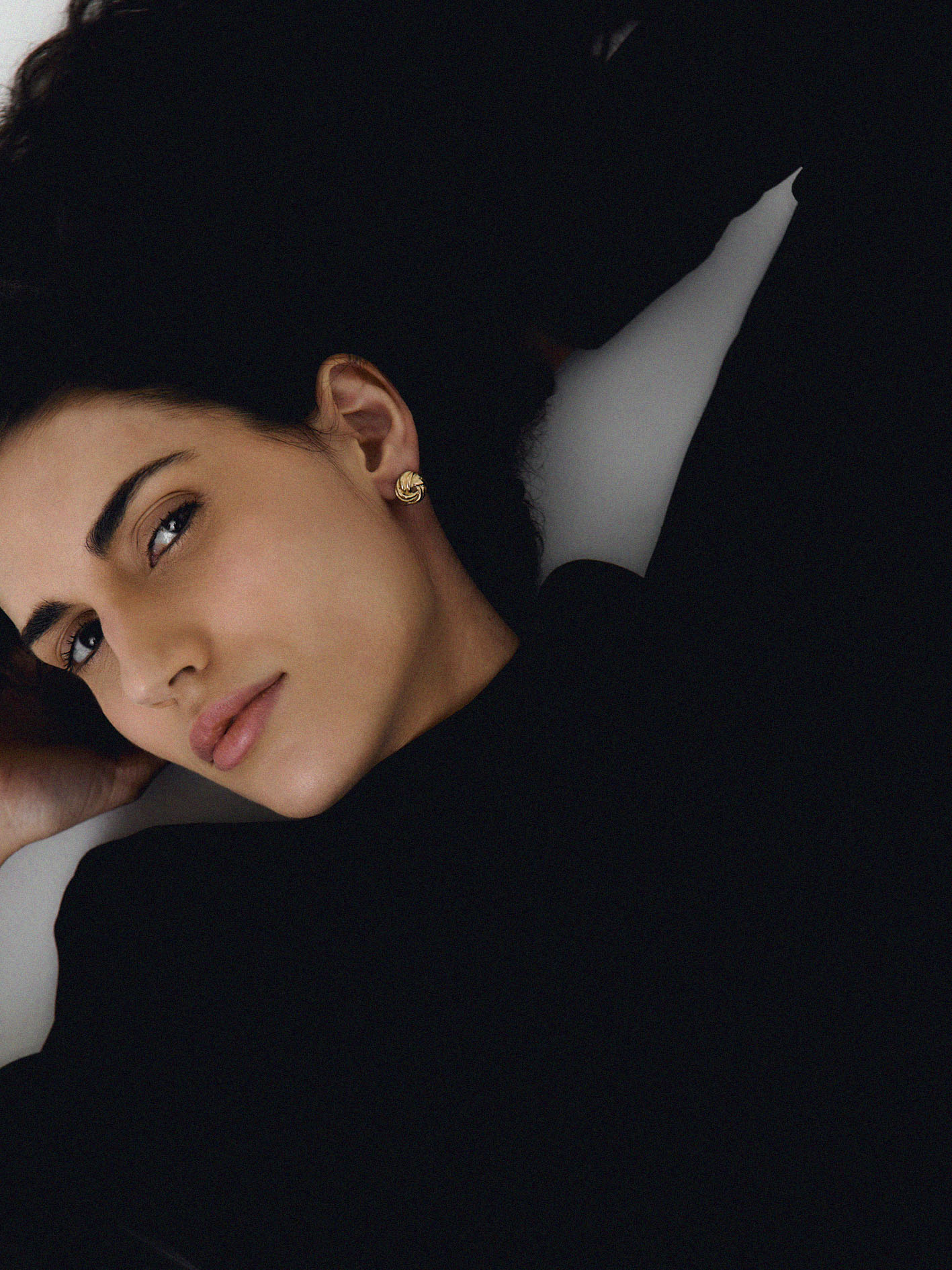 Forma inspirada na joalheria tradicional, com fios entrelaçados.