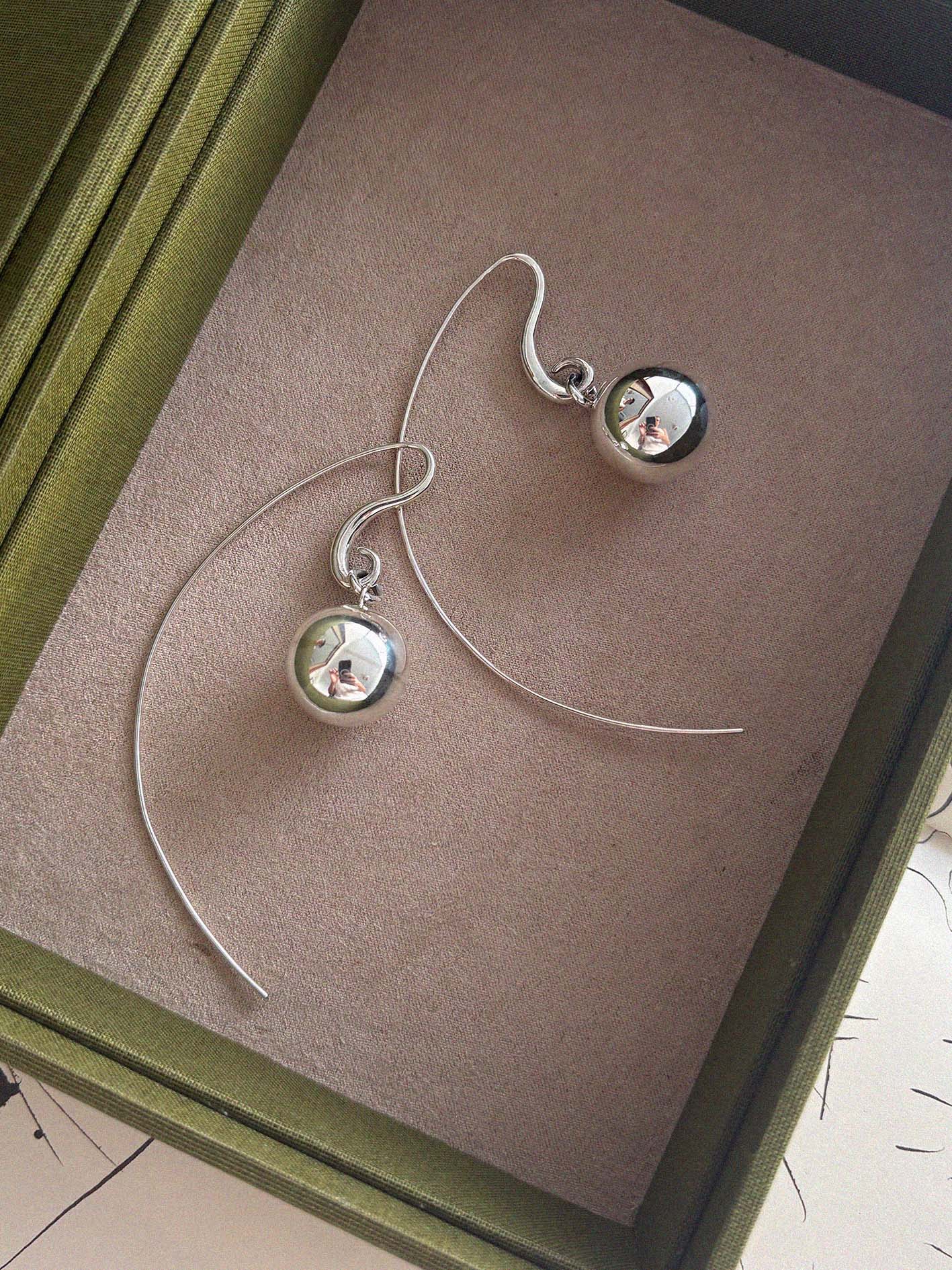Brinco feito em prata 950 com acabamento polido. Peça composta por gancho de formas sinuosas, uma esfera e o detalhe do pino alongado. Pesa aproximadamente 9g e tem 8 cm de altura total (contando o pino). PEÇA FEITA À MÃO NO RIO DE JANEIRO