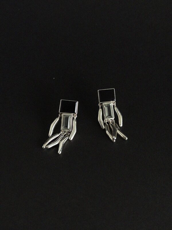 Feita em prata 925 com quartzo negro e cristal é peça confortável de usar, combinada com tarraxas grandes para melhor sustentação.
