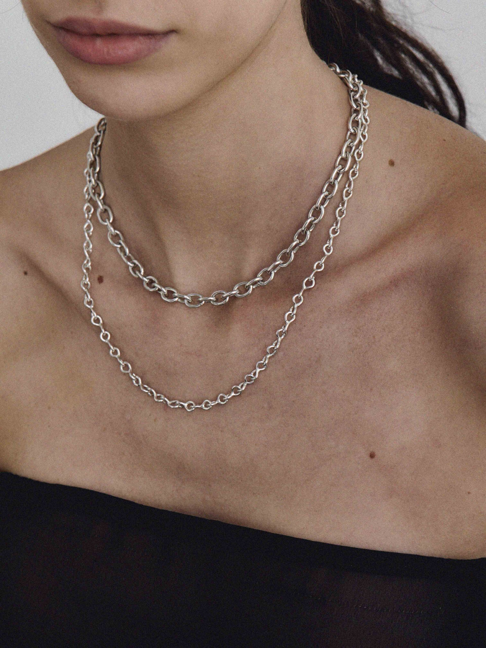 O Colar Silvia Esferas é feito à mão, com elos em forma de S e fecho de formato gancho que permite ajuste de tamanho.